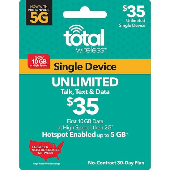 Total Wireless 35 Unlimited 30-Day Prepaid Plan 10GB Data at High Speed 5GB Mobile Hotspot Enabled Email Delivery Digital Model. Rating 45 out of 5 stars with 89 reviews. Ad Free 2-day Shipping On Millions of Items.